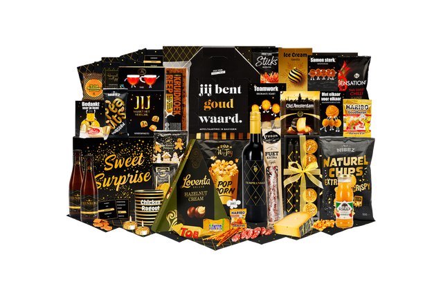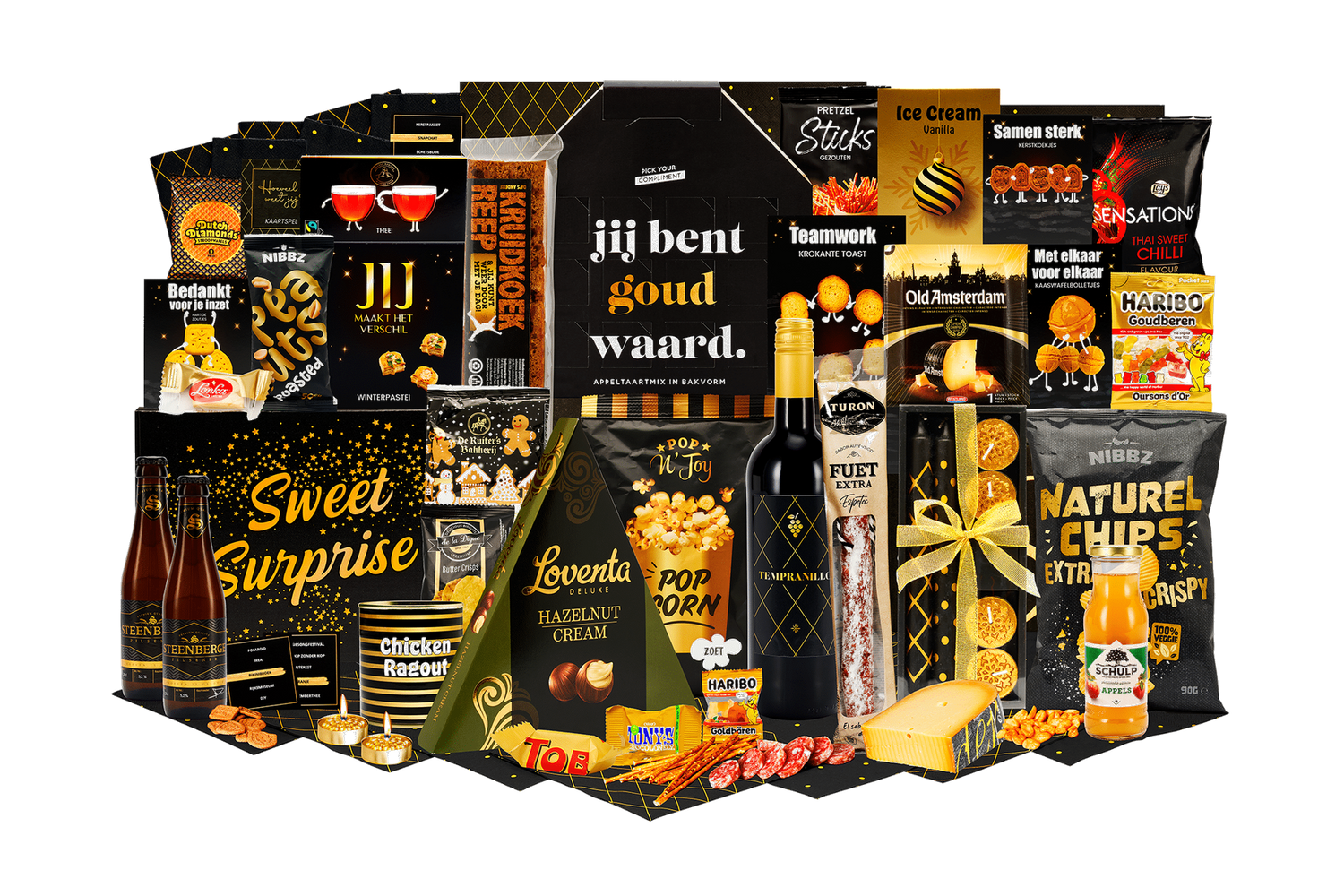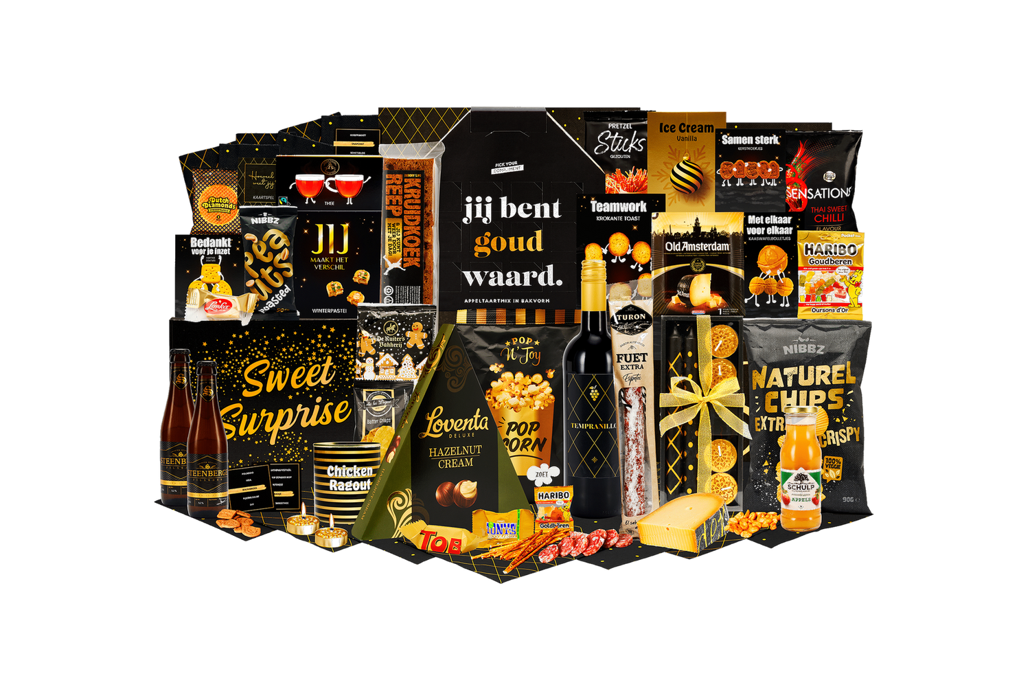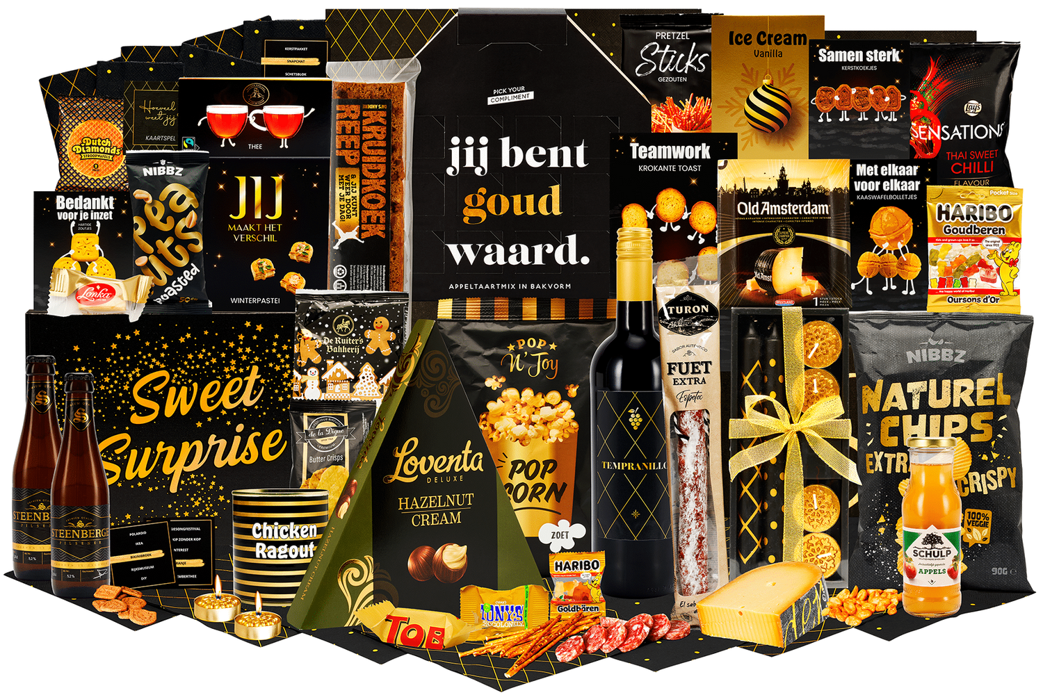 Chique topper. Een stijlvol cadeaupakket boordevol luxe lekkernijen en handige extras. Ideaal om sfeervol te geven tijdens de feestdagen of als relatiegeschenk.