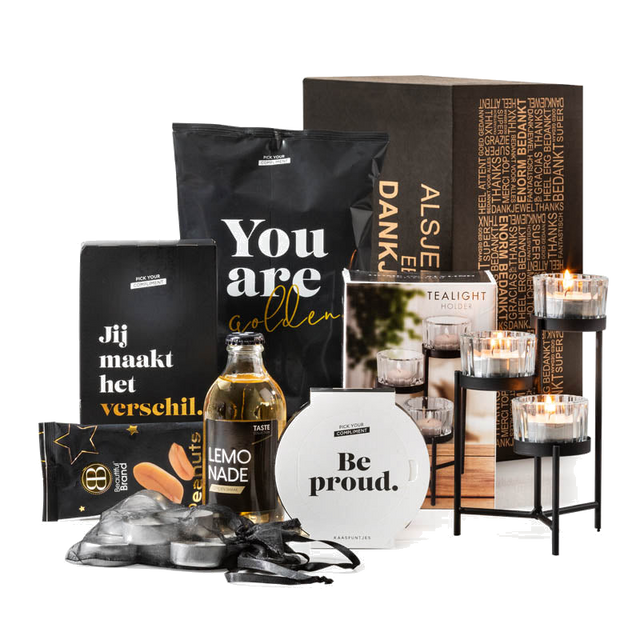 Vier waardering met smaak en stijl met dit elegante kerstpakket. Strak vormgegeven in zwart, wit en goud en voorzien van warme, duidelijke boodschappen, is dit pakket meer dan een presentje: het zegt oprecht en stijlvol “Jij bent belangrijk.” Perfect om medewerkers of zakelijke relaties te bedanken en het teamgevoel te versterken.
