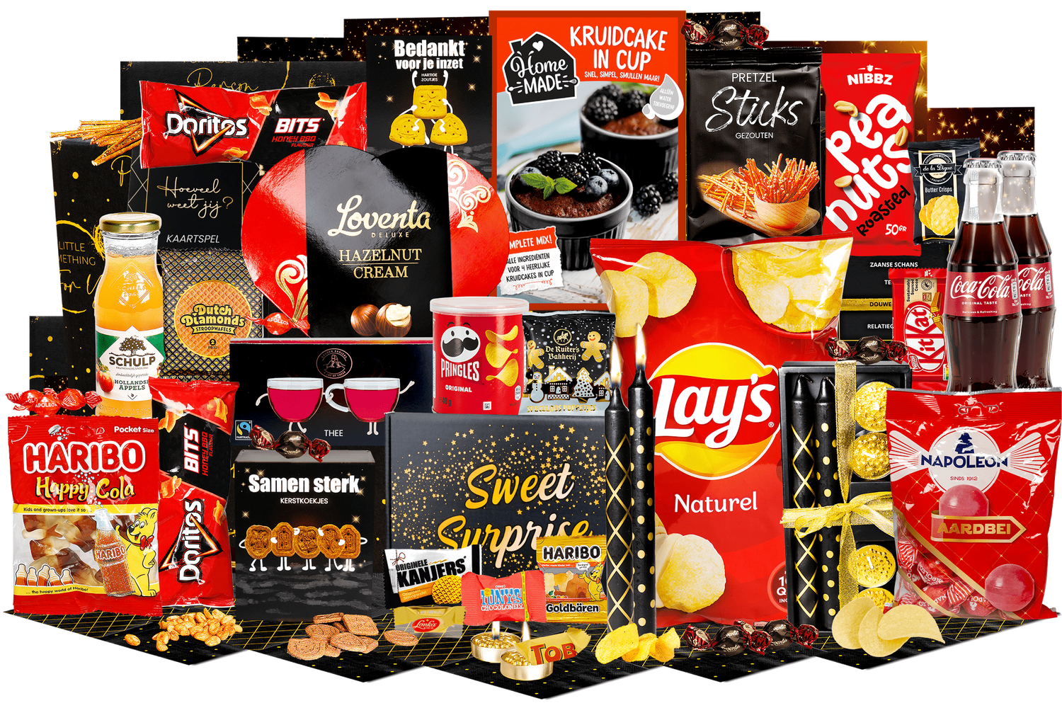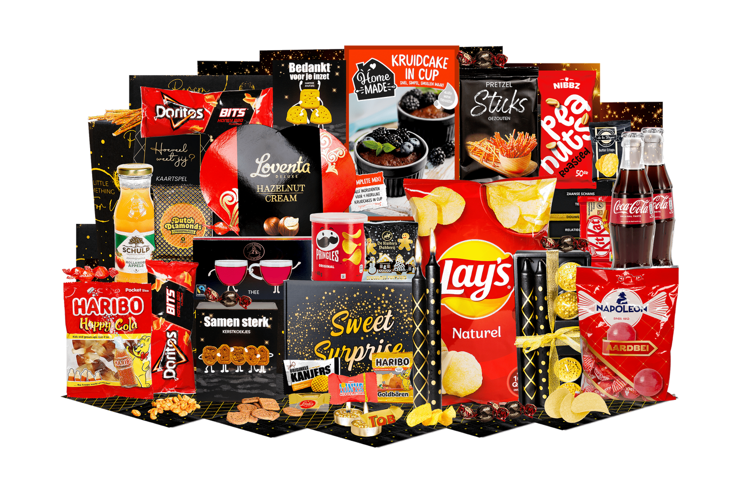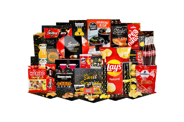 De top in volume biedt een royale selectie van snacks, drankjes en zoete verrassingen. Perfect als cadeau of voor gezellige momenten met vrienden en familie. Alles is feestelijk verpakt en direct klaar om te geven.