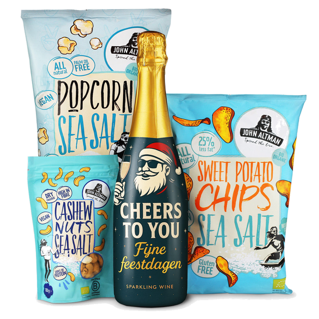 Inhoud: 5 artikelen; 1x Movisa Cava - 0,75l; 1x John Altman Bio Organic Seasalt Popcorn 60gr; 1x John Altman Vegan Sweet Potato Sea Salt 90gr; 1x John Altman Vegan Dry Roasted Cashew Nuts Sea Salt 100g; 1x Luxe geschenkverpakking