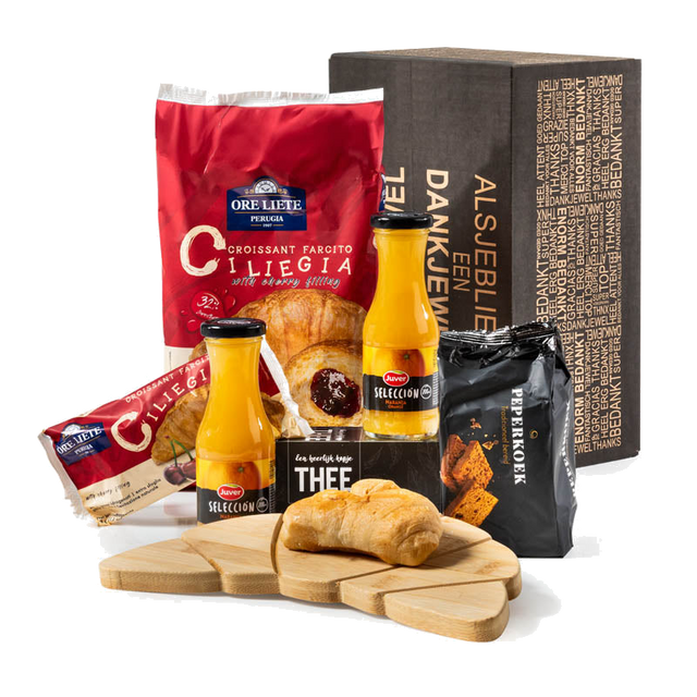 Maak de feestdagen extra bijzonder met dit stijlvolle kerst-ontbijtpakket: een elegant en smaakvol gebaar voor collega’s, relaties of jezelf. Dit zorgvuldig samengestelde cadeau zorgt voor een warm begin van de dag en straalt kwaliteit en klasse uit. De speciale houten serveerplank in croissantvorm geeft meteen sfeer aan het ontbijt, terwijl het assortiment van verse en ambachtelijke producten uitnodigt om te genieten. Verpakt in een fraaie geschenkdoos en beschikbaar zolang de voorraad strekt.
