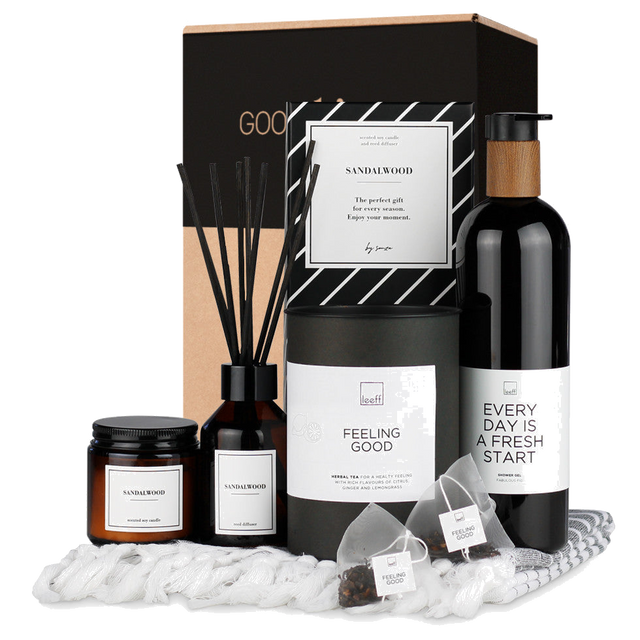 Gun jezelf of iemand anders een moment welverdiende rust met dit heerlijke wellness pakket. Een ontzettend leuk pakket om te geven en te ontvangen. Inhoud: 4 artikelen; 1x Sandalwood Giftbox met geurkaars en geurstokjes; 1x Luxe 'Every Day Is a Fresh Start' douchegel 500ml; 1x Box met 'Feeling Good' herbel tea; 1x Comfortabele hamamdoek