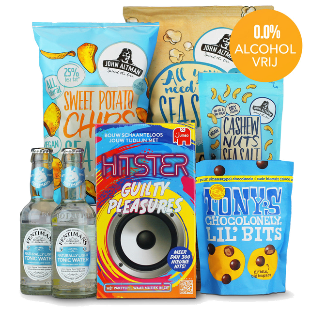 Een perfect geschenk dat gezelligheid en smaak combineert. Of je nu een cadeau zoekt voor je collega’s, personeel of vrienden, dit pakket zorgt voor een feestelijke verrassing vol lekkernijen en spelplezier. Ideaal om te geven of om bij iemand thuis te laten bezorgen! Inhoud: 7 artikelen; 1x Hitster Guilty Pleasure partyspel; 2x Fentimans Tonic Water; 1x John Altman Vegan Dry Roasted Cashew Nuts Sea Salt 100g; 1x Tony's Chocolonely Lil'Bits puur chocokoek sinaasappel 120g; 1x John Altman Bio Organic Seasalt Popcorn 60gr; 1x John Altman Vegan Sweet Potato Sea Salt 90gr; 1x Good Things in Life geschenkdoos