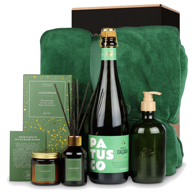 Kom helemaal tot rust onder de mooie donkergroene plaid en geniet van de frisse lichtbruisende witte wijn uit Noord-Portugal. Deze bruisende wijn is gemaakt van de druivenrassen Arinto, Azal, Loureiro en Trajadura. Dit wellnesspakket is het perfecte cadeau om iemand mee te verrassen. Inhoud: 4 artikelen; 1x Sandalwood Giftbox met geurkaars en geurstokjes; 1x Luxe handzeep 475ml; 1x Luxe plaid donker groen; 1x Quinta da Calcada Patusco 75cl