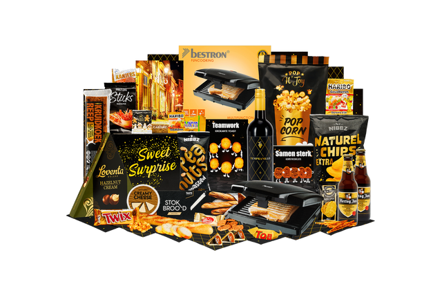 Grill & Chill XXL. Het ultieme cadeaupakket voor gezellige avonden thuis. Een complete mix van hartige snacks, zoete lekkernijen en dranken, aangevuld met een handige sandwichmaker.