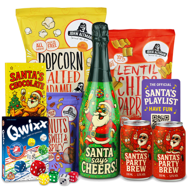 Inhoud: 9 artikelen; 1x Qwixx Dobbelspel; 1x Movisa Cava - 0,75l; 2x Santa's Party Brew Pilsener - 33cl; 1x John Altman Bio Organic Salted Caramel - 60gr; 1x John Altman Vegan Lentil Chips Paprika - 75gr; 1x John Altman Vegan Dry Roasted Cashew Nuts Sweet & Spicy 100g; 1x Reep Santa's Chocolate melkchocolade - 200g; 1x Santa's Playlist; 1x Luxe geschenkverpakking