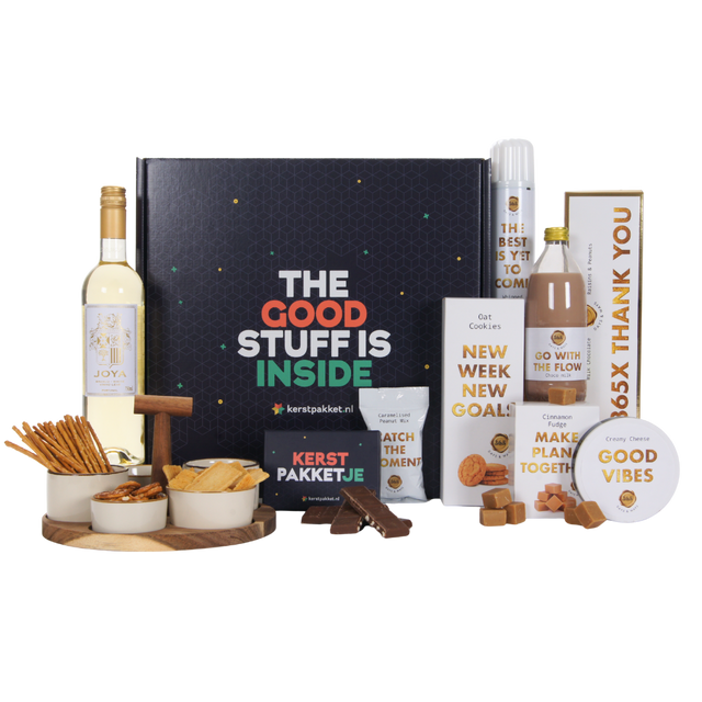 Dit kerstpakket bevat de frisse en elegante Joya Vinho Branco Vinho Regional Lisboa, een Portugese witte wijn met een fruitig karakter, perfect om te serveren bij feestelijke gelegenheden.