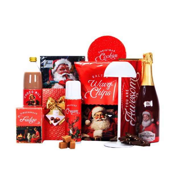 Geniet van de feestelijke lekkernijen van Vintage Christmas: romige chocomelk (500 ml), zachte fudge speculaas (110 g), een koektrommel met kaneelkoekjes (150 g), een royale melkchocoladereep XXL met rozijnen en pinda’s (225 g), knapperige ribbelchips zout (150 g) en luchtige slagroom (250 g). Voor de zoetekauw is er ook de luxe Pral Collection rood (100 g RFA). Inclusief sfeervolle Hush Hush servetten.