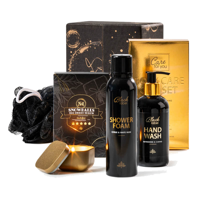 In dit zorgvuldig samengestelde pakket vind je verzorgingsproducten met een zachte, verwennerige geur en een chique uitstraling. De zachte showerfoam reinigt de huid zonder uit te drogen en maakt elke douchebeurt tot een mini-spa ervaring. De bijpassende handwash houdt handen fris en verzorgd, terwijl de zwarte puffspons zorgt voor een luxueuze, schuimige reiniging. Het goudkleurige kaarsje met deksel creëert direct sfeer en warmte in huis. Als zoete afsluiter bevat het pakket heerlijke sneeuwballenchocolade, een kleine verwennerij om bij weg te dromen. Alles wordt geleverd in een bijpassende geschenkdoos die het uitpakken extra feestelijk maakt.