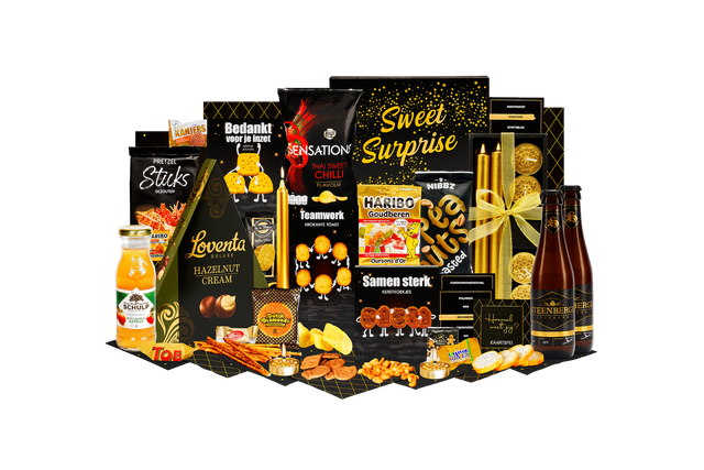 Luxe volume. Een feestelijke geschenkset boordevol smaakvolle lekkernijen en gezellige items. Ideaal als kerstcadeau, relatiegeschenk of voor een feestelijke borrel.