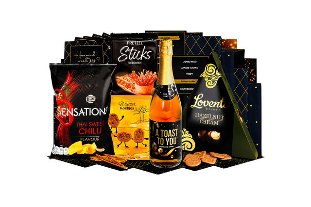 Mooie winter is een feestelijk samengesteld pakket vol lekkernijen en gezelligheid. Perfect als cadeau of voor een warme avond thuis. De combinatie van snacks, chocolade en een sprankelende fles geeft meteen sfeer.