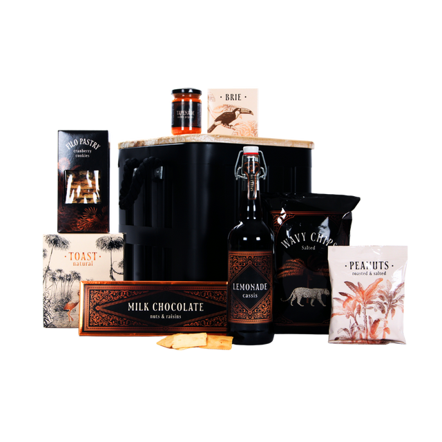 Dit pakket bevat romige brie (125 g), knapperige filo pastry koekjes met cranberry (80 g), zoute pinda’s (100 g), een royale melkchocoladereep XXL met rozijnen en pinda (225 g), krokante ribbelchips zout (90 g) en goudbruine toast (100 g). Voor een warme afsluiting is er geurige zwarte thee (20 zakjes, 30 g).
