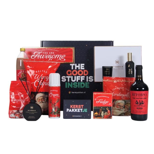 Een verfijnde wijn, heerlijke lekkernijen en een luxe giftset maken dit kerstpakket een feest om te geven én te krijgen.