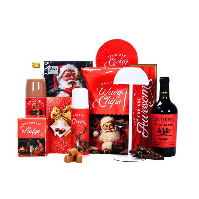 Laat de feestdagen schitteren met de heerlijke traktaties van Vintage Christmas: romige chocomelk (500 ml), zachte fudge speculaas (110 g), een charmante koektrommel met kaneelkoekjes (150 g), een royale melkchocoladereep XXL met rozijnen en pinda’s (225 g), knapperige ribbelchips zout (150 g) en luchtige slagroom (250 g). Voor extra verwennerij is er de luxe Pral Collection rood (100 g RFA). Afgewerkt met stijlvolle Hush Hush servetten.