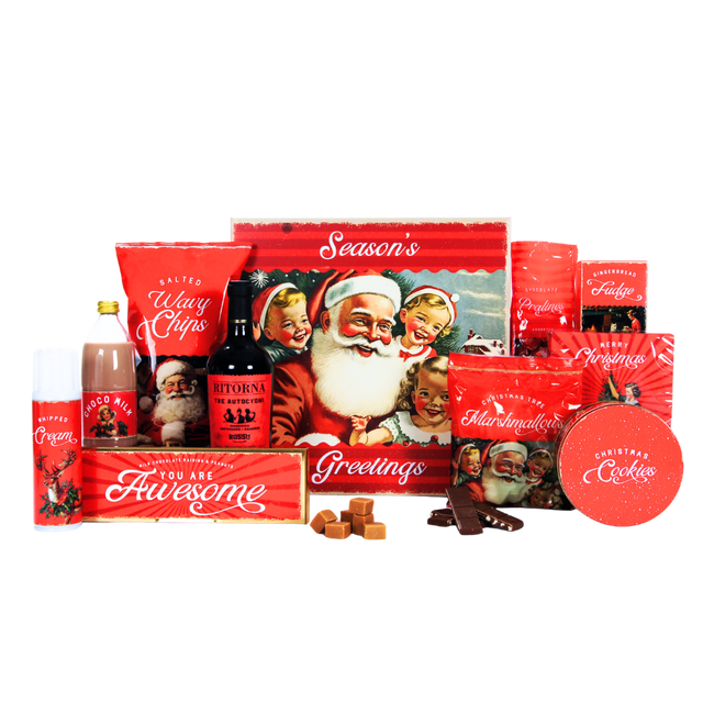 Dit pakket bevat Vintage Christmas bonbons kerstman assorti gevuld (100 g), romige chocomelk (500 ml), zachte fudge speculaas (110 g), een knapperige koektrommel met kaneelkoekjes (150 g), feestelijke marshmallows boompjes (125 g), een royale melkchocoladereep XXL met rozijnen en pinda (225 g) en hartige ribbelchips zout (150 g). Inclusief sfeervolle servetten (20 stuks) om de tafel feestelijk te dekken.