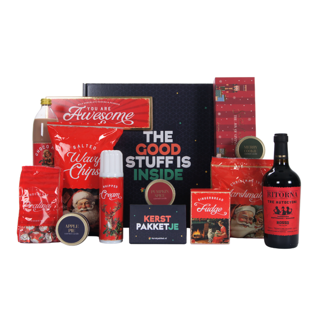 Ontdek de heerlijke Vintage Christmas bonbons in kerstmanvorm (100 g), romige chocomelk (500 ml) en luchtige marshmallows in boompjesvorm (125 g). Daarnaast bevat dit pakket fudge speculaas (110 g), een royale melkchocoladereep XXL met rozijnen en pinda (225 g) en knapperige ribbelchips zout (150 g). Een spuitbus slagroom (250 g) maakt de warme dranken en desserts extra feestelijk.
