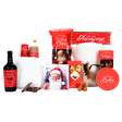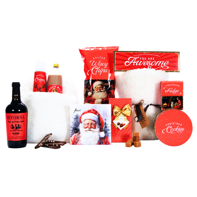 Dit kerstpakket is gevuld met heerlijke Vintage Christmas lekkernijen: romige chocomelk (500 ml), ambachtelijke fudge speculaas (110 g), een charmante koektrommel met kaneelkoekjes (150 g), een royale melkchocoladereep XXL met rozijnen en pinda’s (225 g), knapperige ribbelchips zout (150 g) en luchtige slagroom (250 g). De luxe Praline collectie rood (100 g RFA) voegt een extra vleugje zoet toe. Afgewerkt met feestelijke Happy Santa servetten.