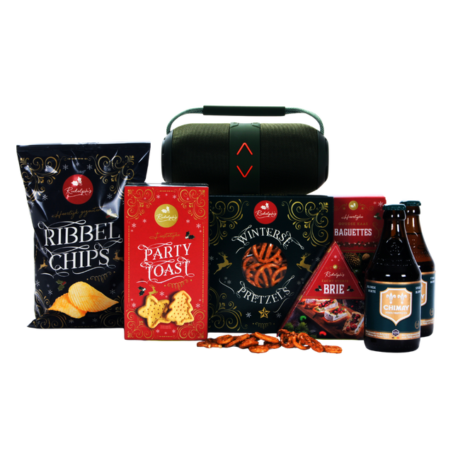 Geniet van knapperige Rudolph ribbelchips gezouten, romige brie, krokante party toast, smaakvolle Goudse kaas baguettes en hartige winter pretzels. Een kerstpakket dat gezelligheid, smaak en muziek op een heerlijke manier samenbrengt.
