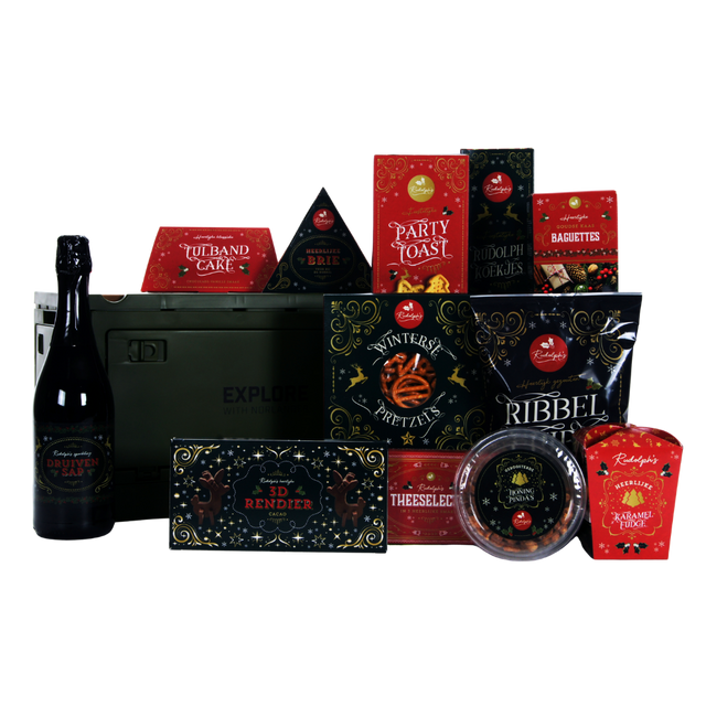 De feestelijke inhoud bestaat uit een thee selectie met drie smaken, een charmant 3D cacao rendier, zachte fudge, knapperige cookies, een luchtige tulband cake duo choco vanille, ribbelchips gezouten, romige brie, zoete en zoute honey roasted peanuts en krokante party toast. Een kerstpakket dat sfeer, smaak en bruikbaarheid moeiteloos samenbrengt.
