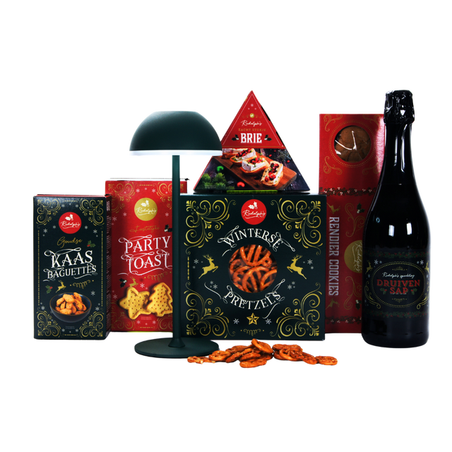 De borreltafel wordt compleet met knapperige Rudolph cookies, romige brie, luchtige party toast, hartige Goudse kaas baguettes en goudbruin gebakken winter pretzels. Een kerstpakket dat uitnodigt om samen te genieten, proosten en herinneringen te maken.