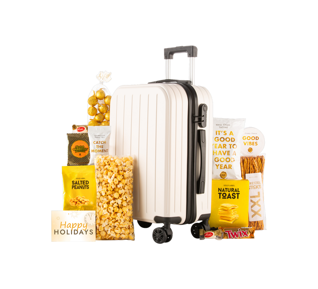 Verras vrienden, familie of zakelijke relaties met dit stijlvolle en smaakvolle snackpakket verpakt in een compacte handbagage koffer van 38 liter. Perfect als kerstcadeau, relatiegeschenk of als attentie tijdens de feestdagen. Elk item is met zorg geselecteerd om een balans te bieden tussen zoete en hartige smaken. De feestelijke geschenkdoos en bijgevoegde Happy Holidays kaart maken het geheel direct cadeauklaar.