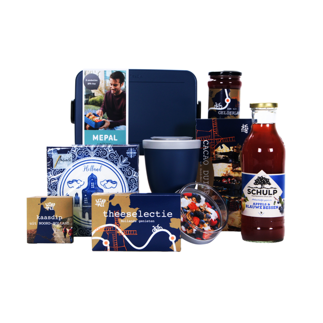 Dit kerstpakket wordt aangevuld met smakelijke Wind Mee-specialiteiten: halva vruchtenjam aardbei, een thee selectie met drie verfijnde smaken, knapperige cacao duimpjes en romige smeer & dipkaas. Inclusief feestelijke Holland Style servetten. Een geschenk dat smaak, stijl en praktisch gemak moeiteloos samenbrengt.