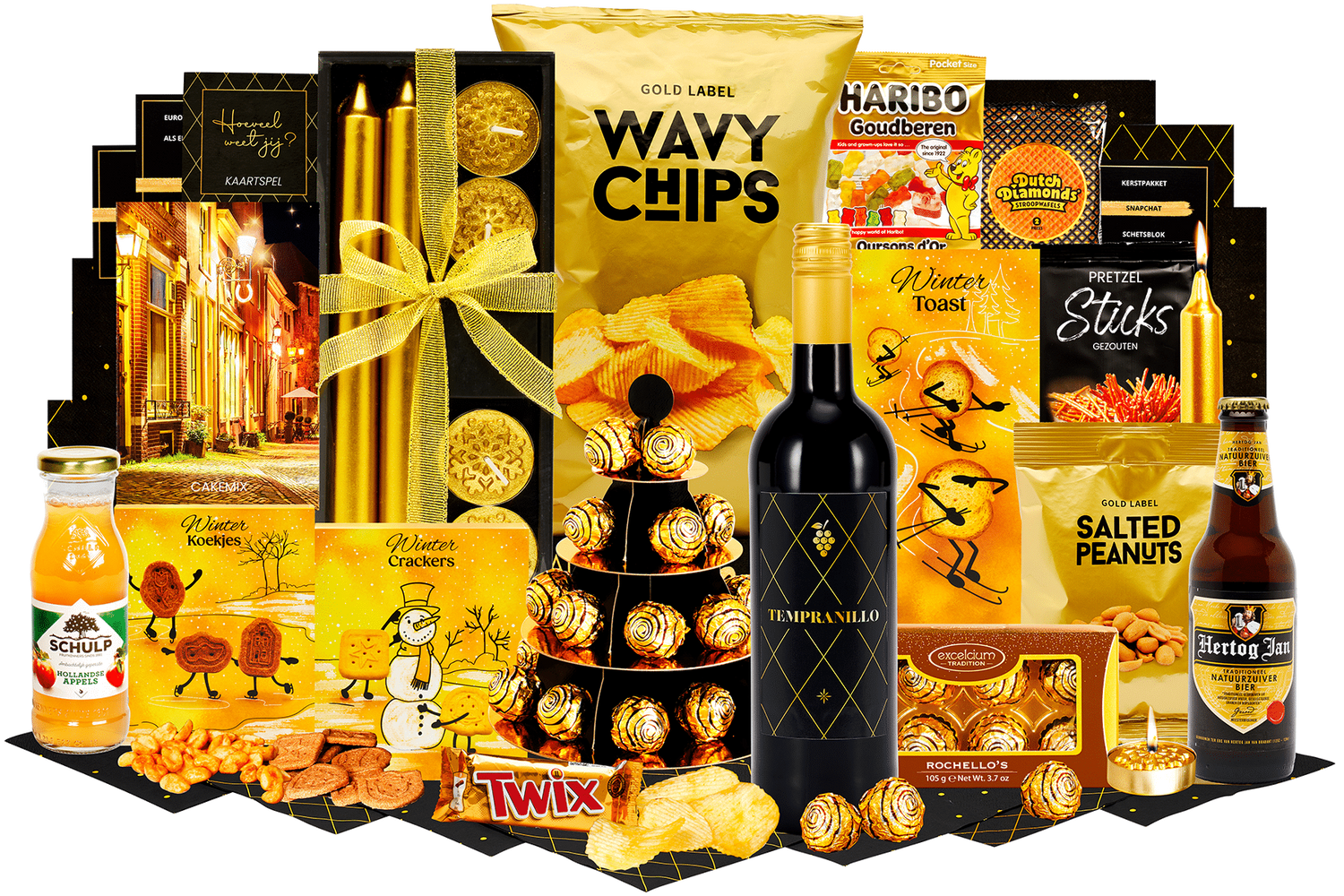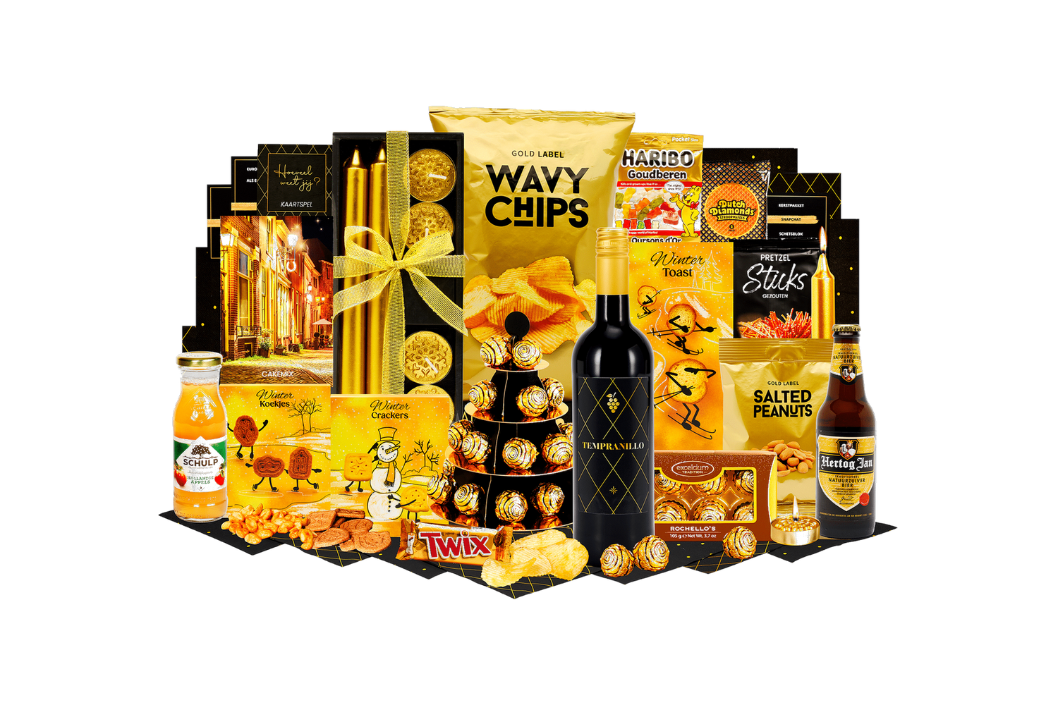 Stralend goud is een feestelijke cadeaubox vol luxe lekkernijen en sfeervolle accessoires. Perfect om direct te geven en samen van te genieten. Alles stijlvol verpakt en klaar voor de feestdagen.