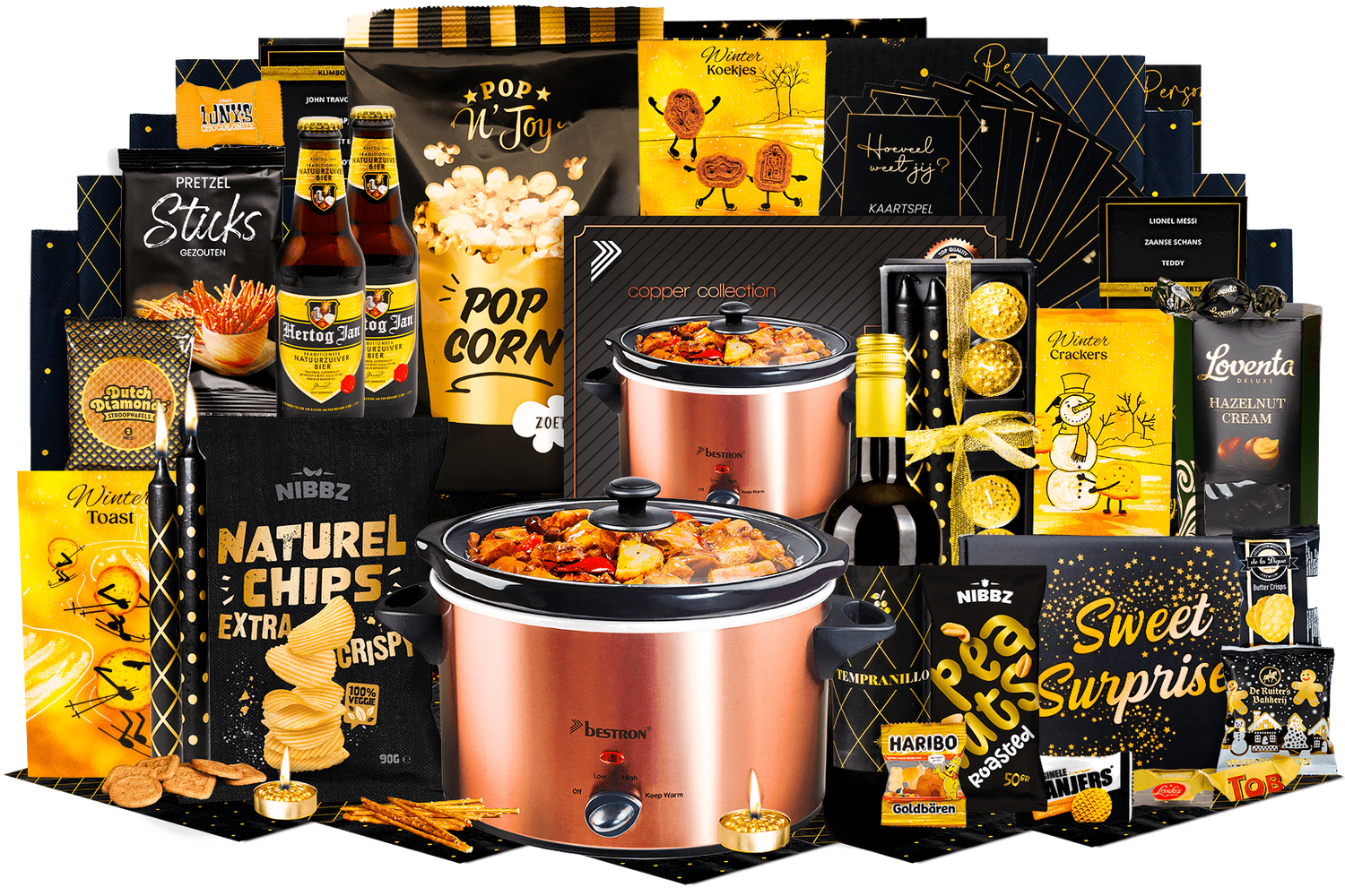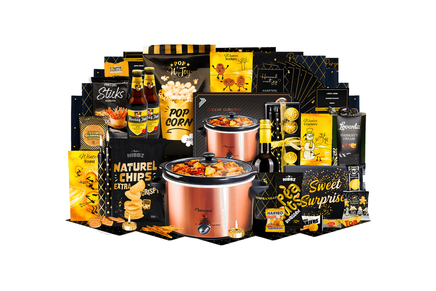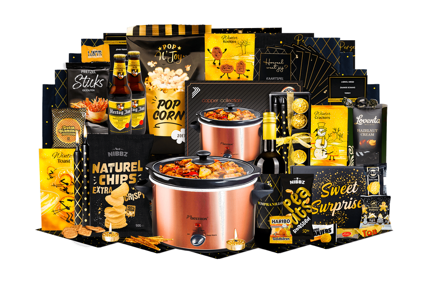 Lekker koken! Deze complete kerstbox maakt koken en borrelen eenvoudig en sfeervol. Slowcooker, dranken en een ruime selectie hartige en zoete snacks zorgen voor gemak en gezelligheid tijdens elke bijeenkomst.