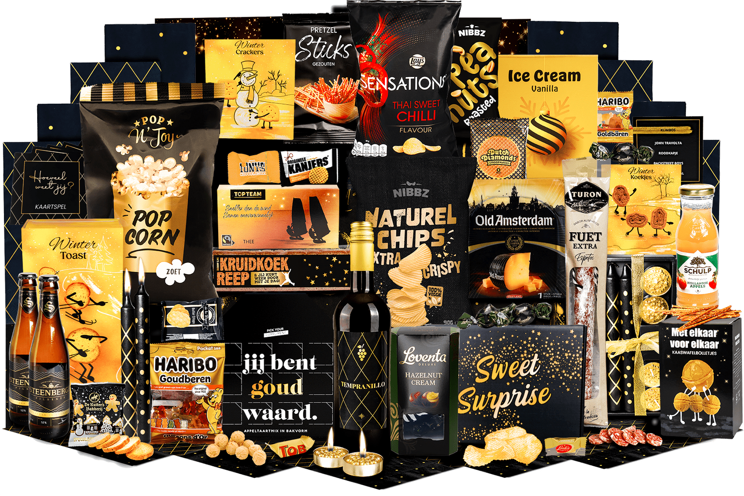 Veel luxe. Een stijlvolle en volle cadeaubox boordevol lekkernijen en borrelproducten. Perfect als relatiegeschenk of voor een feestelijke borrel thuis.