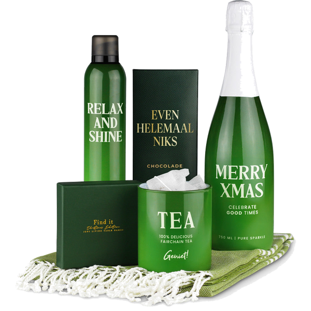 Ideaal om cadeau te doen aan collega’s, werknemers of vrienden die je wilt bedanken of verrassen. Met de complete samenstelling, prachtige verpakking en exclusieve uitstraling is dit wellness pakket een uniek en origineel zakelijk geschenk. Inhoud: 7 artikelen; 1x Movisa Cava - 0,75l; 1x Showergel Relax and Shine; 1x Reep Even helemaal Niks melkchocolade - 200g; 1x Hammam handdoek; 1x JENS Living Find It Spel Kerst; 1x Box met Fairchain tea; 1x Luxe geschenkverpakking