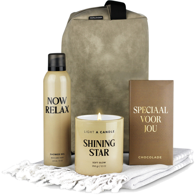Dit wellness pakket is het perfecte geschenk voor collega’s, werknemers of vrienden die een moment van rust en verwennerij verdienen. Een uniek en origineel cadeau dat zakelijk én persoonlijk gewaardeerd wordt. Inhoud: 6 artikelen; 1x NORLÄNDER Nubuck Toilettas 2.0 Taupe; 1x Showergel Now Relax; 1x Kaars Light a Candle Shining Star; 1x Hammam handdoek; 1x Reep Speciaal voor Jou melkchocolade - 200g; 1x Luxe geschenkverpakking
