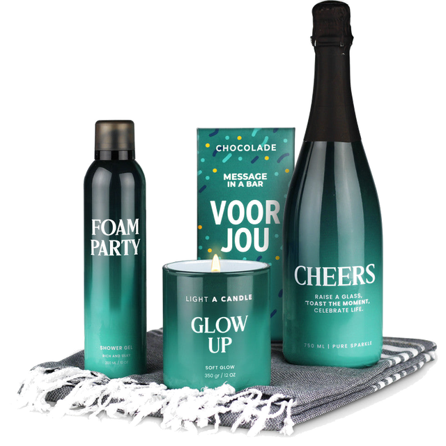 Of het nu gaat om waardering op de werkvloer, een jubileum of een persoonlijke attentie, dit wellness pakket is een uniek en origineel cadeau. Dankzij de stijlvolle uitstraling en prachtige verpakking is het een zakelijk geschenk dat gegarandeerd indruk maakt en warmte uitstraalt. Inhoud: 6 artikelen; 1x Movisa Cava - 0,75l; 1x Showergel Foam Party; 1x Kaars Light a Candle Glow Up; 1x Hammam handdoek; 1x Reep Helemaal voor Jou melkchocolade - 200g; 1x Luxe Geschenkverpakking