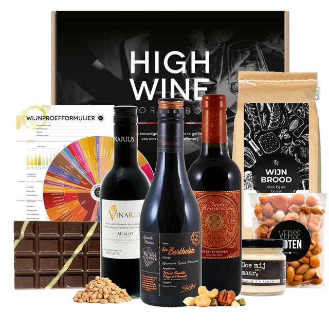 Het pakket is ideaal voor een gezellige High Wine of een leerzame proefsessie. Bijgeleverd vind je duidelijke instructies, proefformulieren en een aromawiel waarmee geuren en smaken eenvoudig te herkennen zijn. Zo proef je bewuster en leer je stap voor stap meer over wijn, terwijl je geniet van ambachtelijke lekkernijen zoals vers wijnbrood en een luxe notenmix.