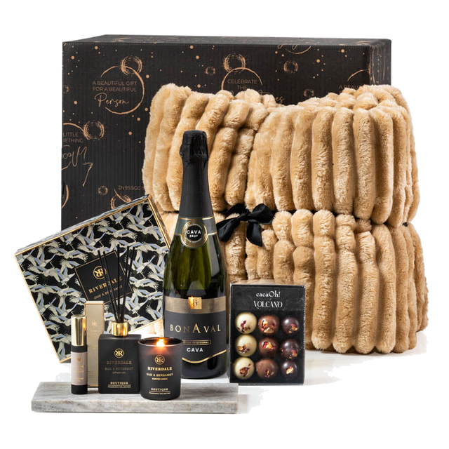 Trakteer uzelf of een dierbare op een moment van pure luxe met deze zorgvuldig samengestelde cadeaubox. Het zachte, warme plaid in een tijdloze beige tint nodigt uit om weg te kruipen met een goed boek of film. Het elegante marmeren plateau voegt een subtiel designaccent toe aan elk interieur en is perfect om hapjes of kaarsen stijlvol te presenteren. Verfijn de sfeer met de luxe Riverdale Olivia geoset in de verfijnde geur Oud & Bergamot en hef het glas op speciale momenten met een fijne fles Bonaval Cava Brut. Een doos vol comfort, smaak en design — ideaal als cadeau voor huiselijke verwennerij.