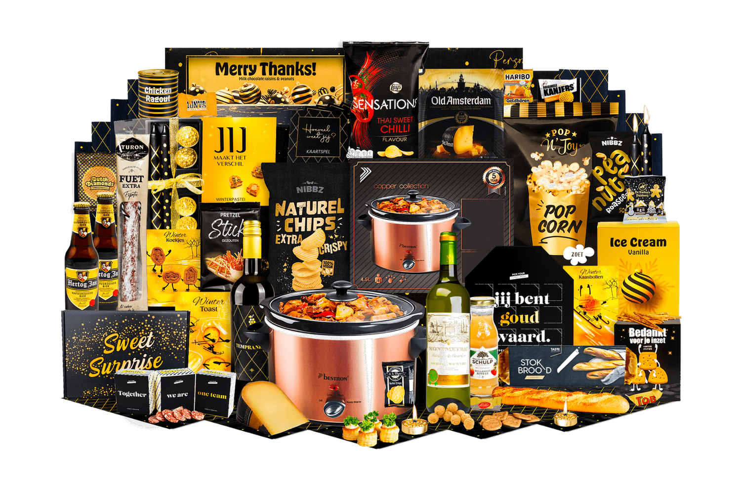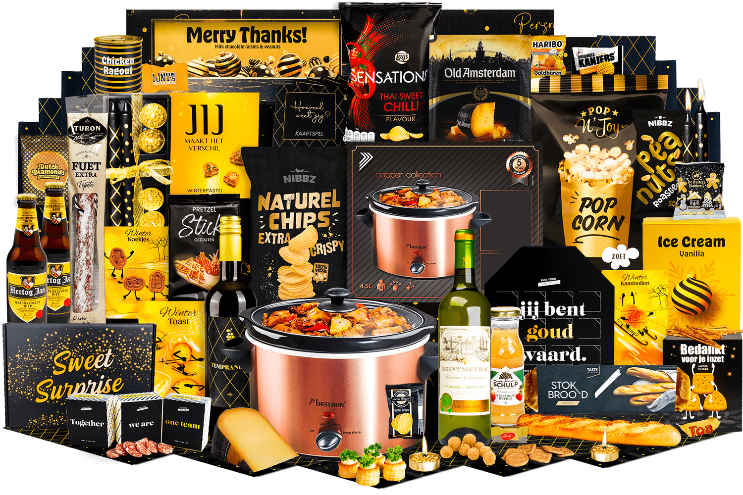 Geurige Stoofmomenten. Alles voor gezellige, smaakvolle stoofavonden in één cadeaupakket. Inclusief slowcooker, dranken en een ruime selectie hartig en zoet.