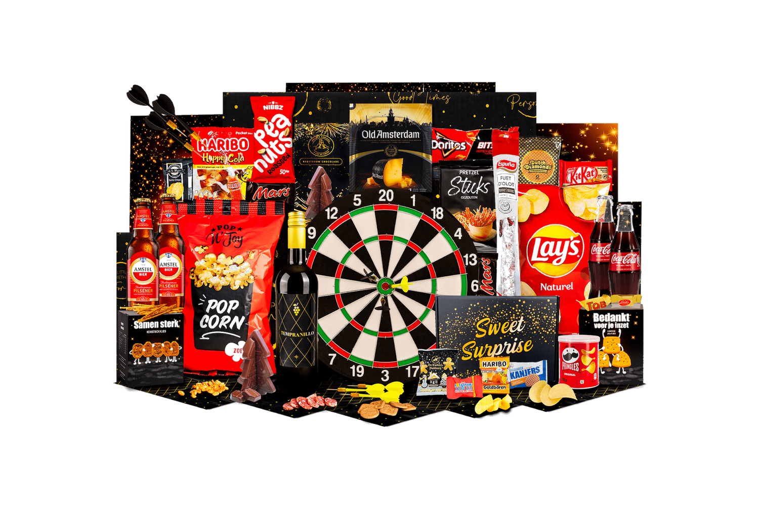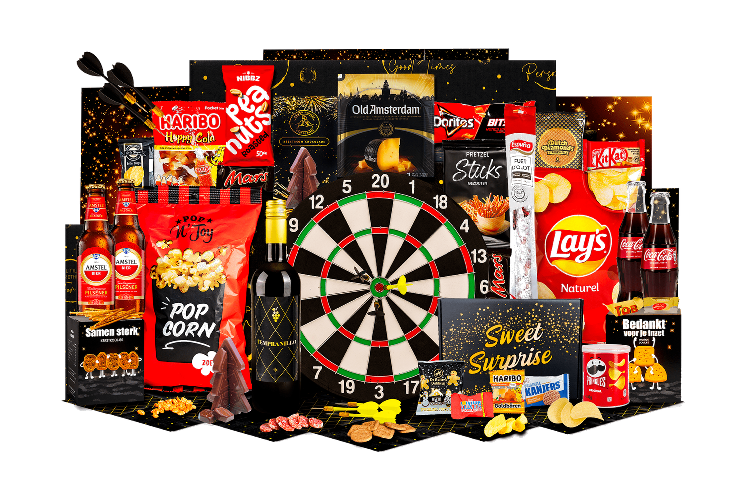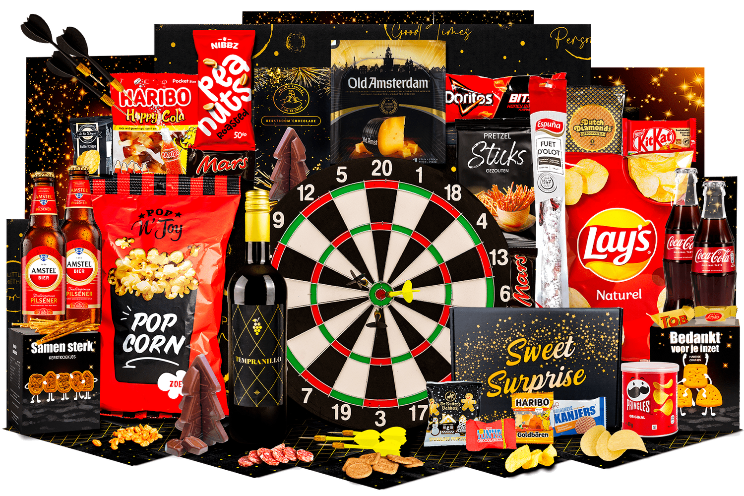 Spelen en uitpakken. Een complete, feestelijke box met spel en lekkernijen voor gezellige avonden en verrassingen. Handig verpakt en direct klaar om cadeau te geven of samen van te genieten.
