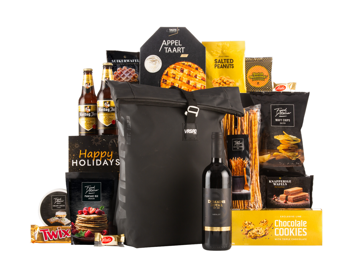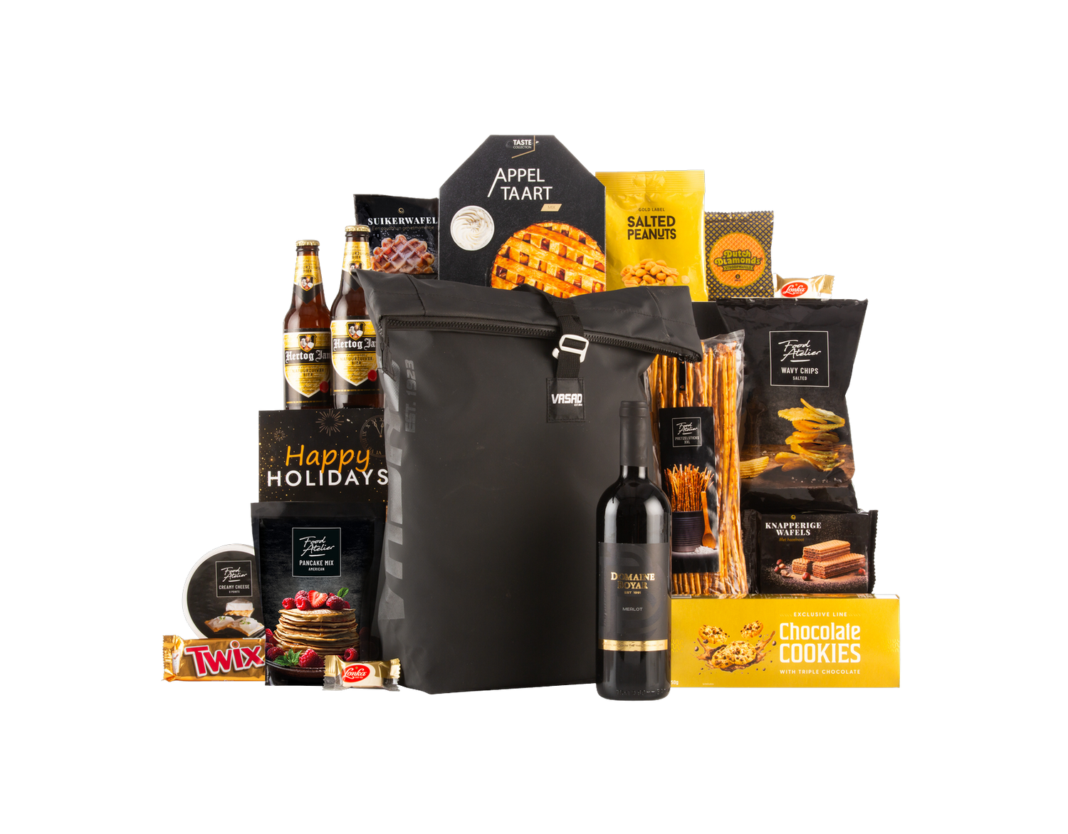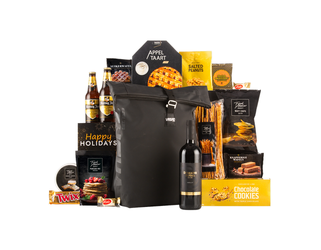 Verras iemand met het ultieme cadeau voor de feestdagen: een luxe geschenkbox gevuld met zorgvuldig geselecteerde lekkernijen en een heerlijke fles rode wijn. Dit all-weather rugzakpakket is perfect om te delen tijdens gezellige momenten of als stijlvol relatiegeschenk. Elke box is smaakvol verpakt in een feestelijke geschenkdoos en inclusief een vrolijke kerstkaart met de tekst Happy Holidays. Bestel vandaag nog en maak de feestdagen onvergetelijk.