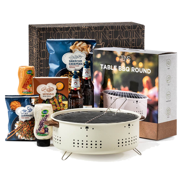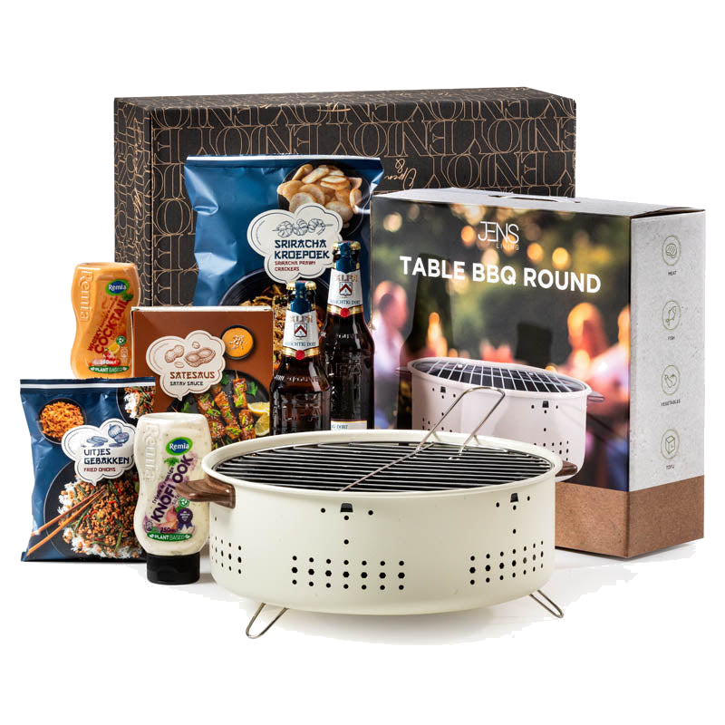 De compacte ronde tafelbarbecue vormt het hart van het pakket: robuust genoeg voor echte grillsmaken, maar klein en stijlvol genoeg om overal neer te zetten. Voeg Aziatische accenten toe met pittige sriracha kroepoek en romige satésaus, maak gerechten af met knapperige gebakken uitjes en geef je spreads extra diepgang met Remia knoflook- en whisky cocktailsaus. Serveer er een krachtig Alfa Dort bij voor een volle, evenwichtige smaak. Samengepakt in een elegante geschenkdoos is dit het ideale cadeau voor iedereen die van buiten koken, hartige smaken en sfeer houdt.