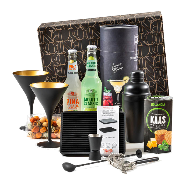 Het pakket combineert hoogwaardige materialen en een verfijnde uitstraling: twee goudkleurige cocktailglazen met een modern zwart accent, een compacte en complete cocktailset in zwart metaal en praktische ijsvormpjes om mooie blokjes of bolletjes te maken. Voor de smaak zijn er twee tropische cocktails met alcohol, samen met hartige en knapperige snacks die de perfecte balans geven tussen zoet en zout. Alles wordt geleverd in een bijpassende cadeauverpakking, klaar om te overhandigen.
