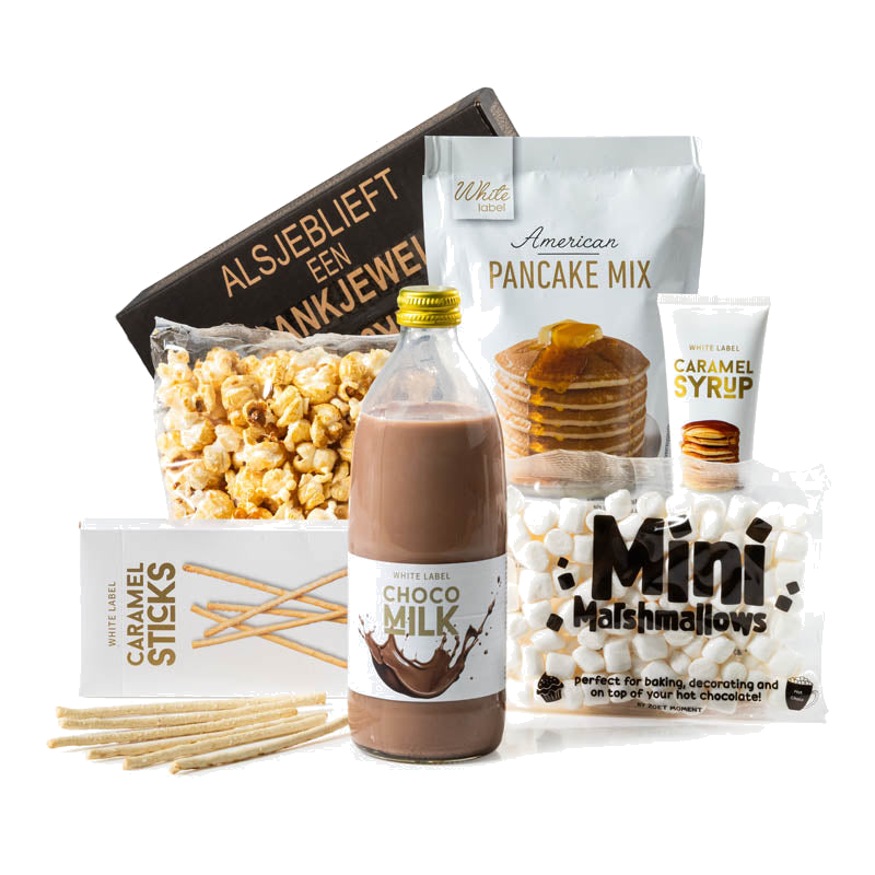 Waarom kiezen voor dit kerstpakket? Het is een kant-en-klaar, sfeervol cadeau dat direct inzetbaar is: maak warme chocomelk, voeg marshmallows toe, bak pannenkoeken met de mix en werk ze af met de rijke karamelstroop. De karamelsticks en zoete popcorn geven net dat beetje extra traktatie. Elk product is zorgvuldig geselecteerd om een complete beleving te bieden — makkelijk om te geven en heerlijk om te ontvangen.