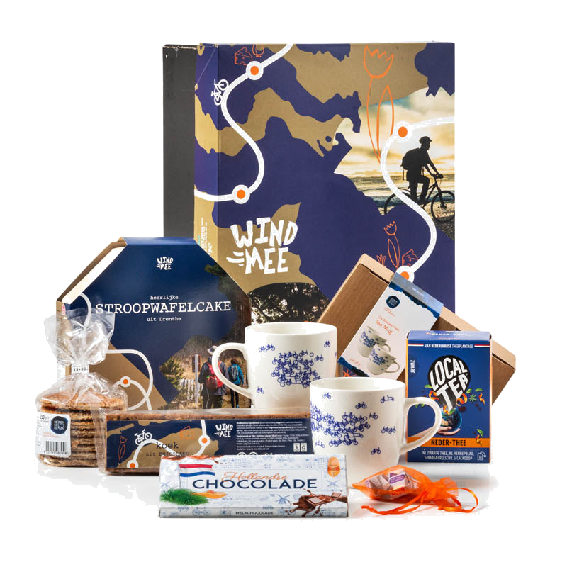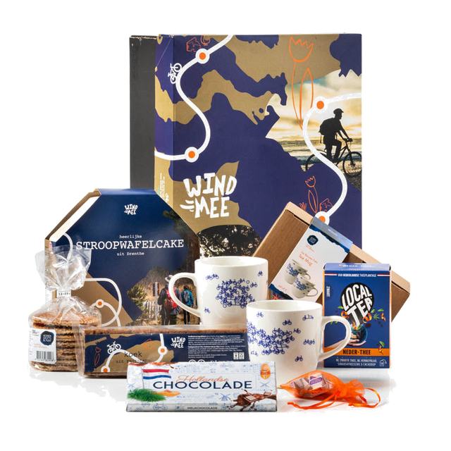 Het pakket straalt ambacht en Nederlands vakmanschap uit. De Delftsblauwe ontwerpen tonen diverse fietsen — van ouderwetse oma-fietsen tot moderne e-bikes — en vormen een speels, sfeervol beeld dat uitnodigt tot ontdekken. Een QR-code leidt naar leuke fiets- en wandelroutes, ideaal voor wie na de feestdagen frisse buitenlucht zoekt en Nederland wil verkennen. Verpakt in een stijlvolle geschenkdoos met Hollandse print is dit pakket meteen klaar om weggegeven te worden.