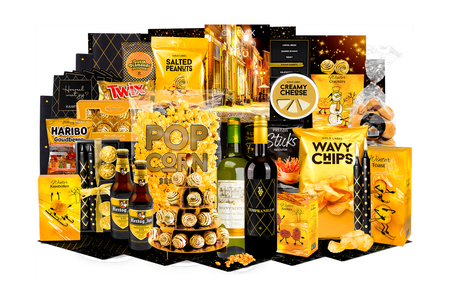 Goud waard is een feestelijke cadeaubox boordevol lekkernijen en sfeervolle accessoires. Perfect als kerstcadeau of relatiegeschenk. Net verpakt en direct klaar om te geven.