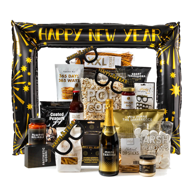 De zorgvuldig samengestelde inhoud nodigt uit tot samen delen en proeven: van feestelijke bubbels en knapperige borrelhapjes tot zoete versnaperingen en handige pantryproducten voor thuis. Het gouden en zwarte thema geeft het geheel een elegante, eigentijdse uitstraling, terwijl het opblaasbare Happy New Year photo frame en de ludieke partybrillen direct zorgen voor sfeer en fotomomenten op oudjaarsavond.