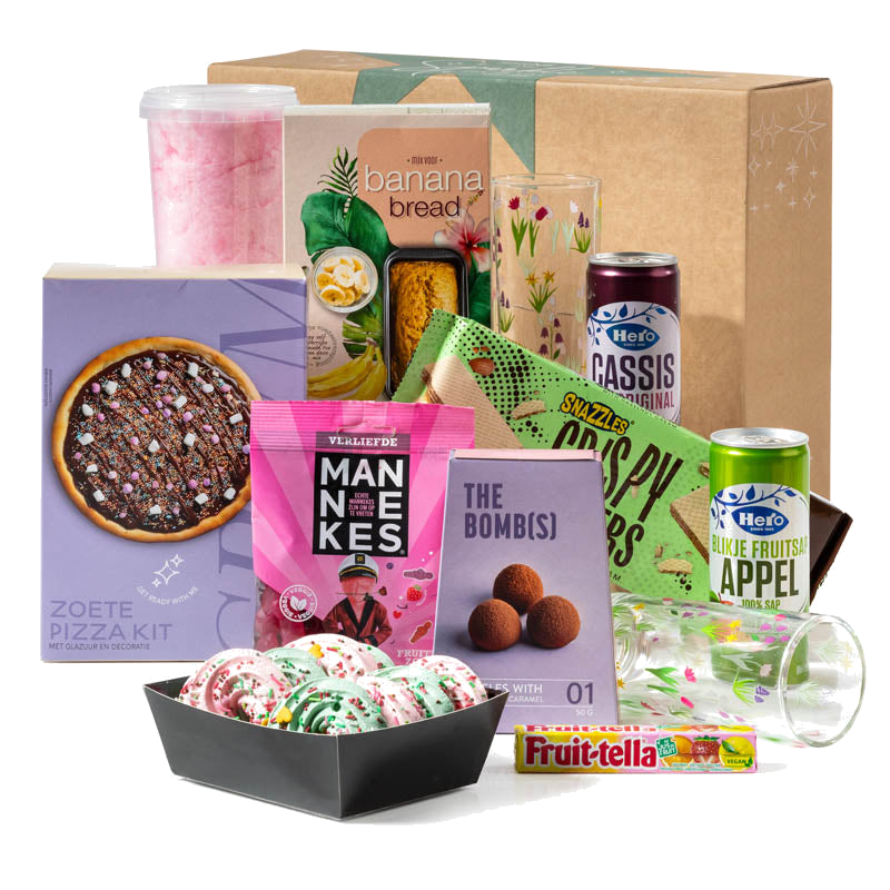 Of je nu houdt van bakken, snoepen of gezellig samen drinken — deze geschenkdoos biedt voor ieder wat wils. Mix een snelle banana bread, bak feestelijke kransjes, serveer limonade in vrolijke glazen of geniet van zachte truffels en suikerspin. Alles wordt gepresenteerd in een bijpassende cadeauverpakking, klaar om te geven.
