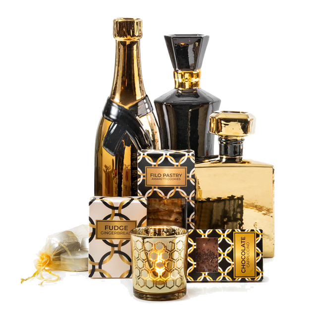 Het pakket bevat drie decoratieve vazen in zwart en goud die met een enkele bloem of tak direct het middelpunt van de kamer worden. De vazen variëren in hoogte en design: twee parfumfles-achtige vormen en één champagnefles-vorm, elk met een verfijnde afwerking die luxe uitstraalt. Een bijpassende theelichthouder en maxi theelichten zorgen voor een warme, feestelijke gloed terwijl de geselecteerde zoetigheden ideaal zijn om te delen tijdens de feestdagen.