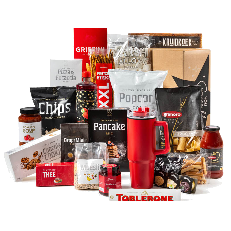 Verras deze feestdagen met een luxe kerstpakket dat van ochtends tot avonds voor smaakvolle momenten zorgt. Centraal staat een trendy thermosbeker in stijlvol rood: dé must-have voor onderweg, op kantoor of tijdens het sporten. Rondom deze eyecatcher vind je een zorgvuldig samengestelde selectie van zoete en hartige lekkernijen, van ontbijt en borrel tot warme maaltijden en dessert. Perfect als relatiegeschenk, personeelsattentie of bijzonder presentje voor vrienden en familie.