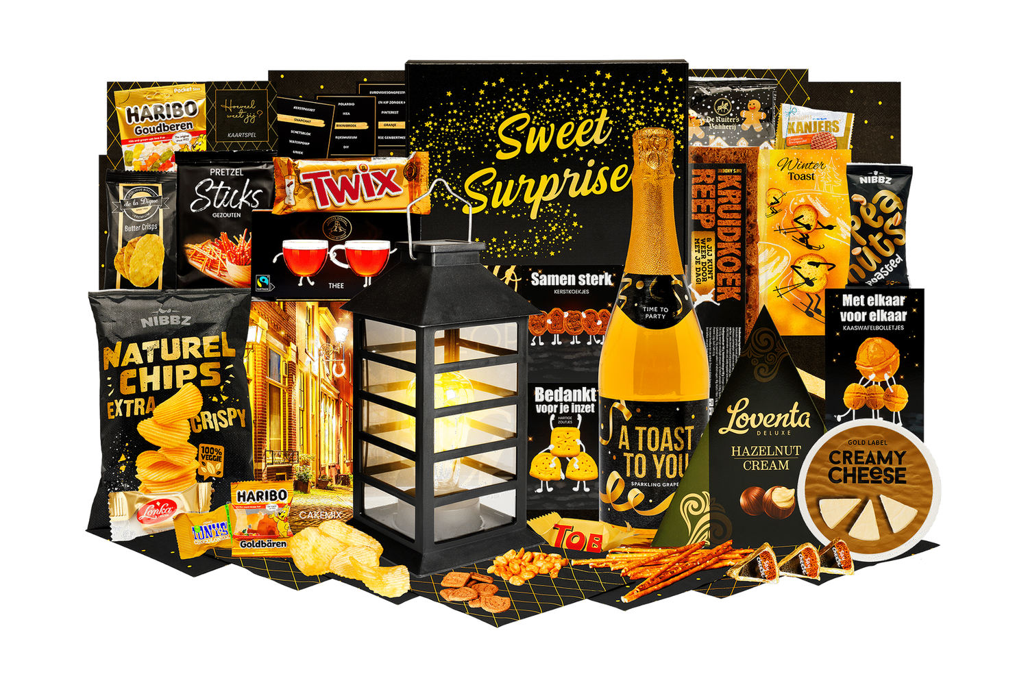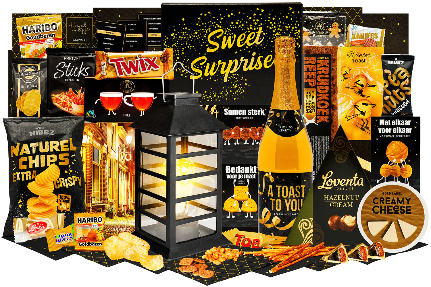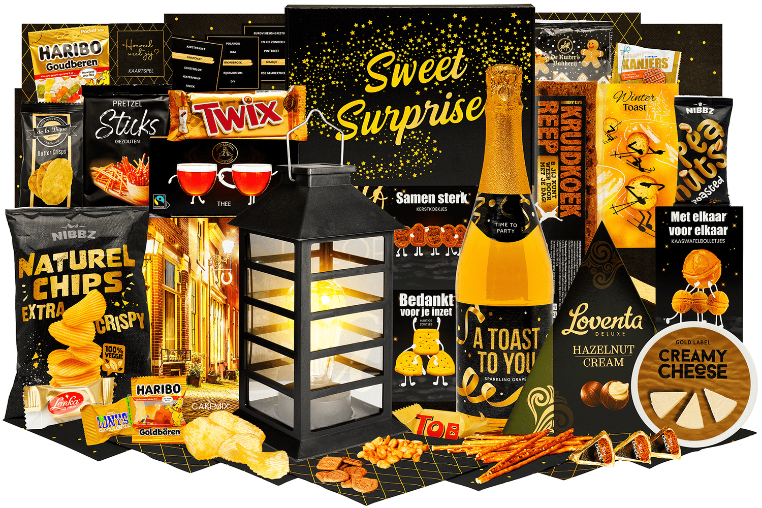 Natuurlijk licht brengt sfeer en lekkers samen. Een feestelijke selectie met hartige en zoete snacks en een solar lantaarn voor warme verlichting. Klaar om cadeau te geven en direct te genieten.