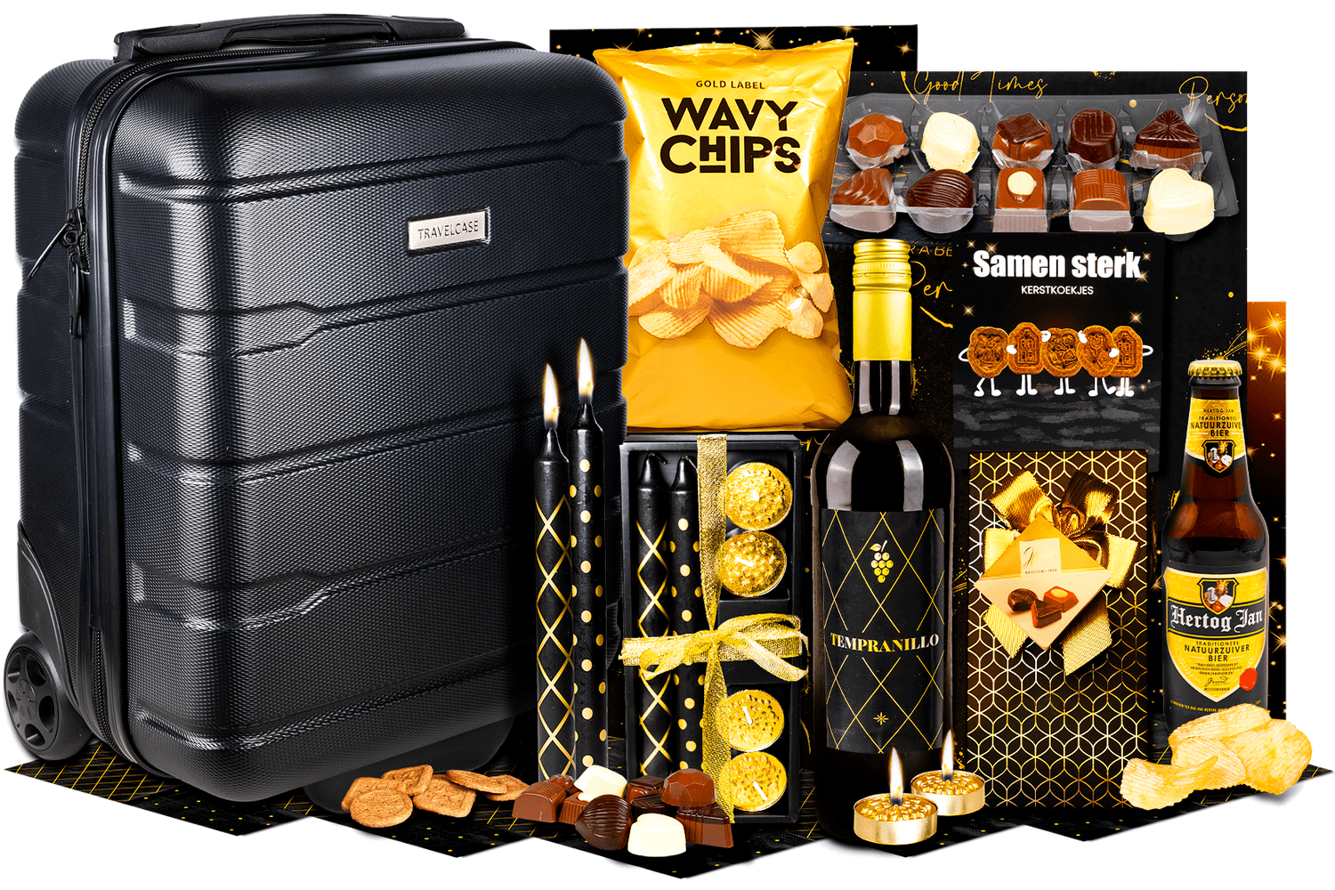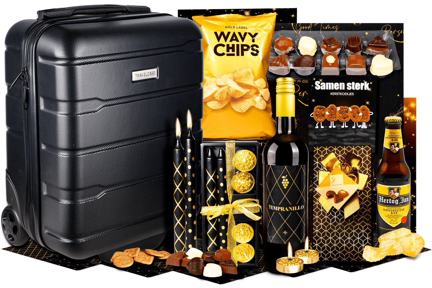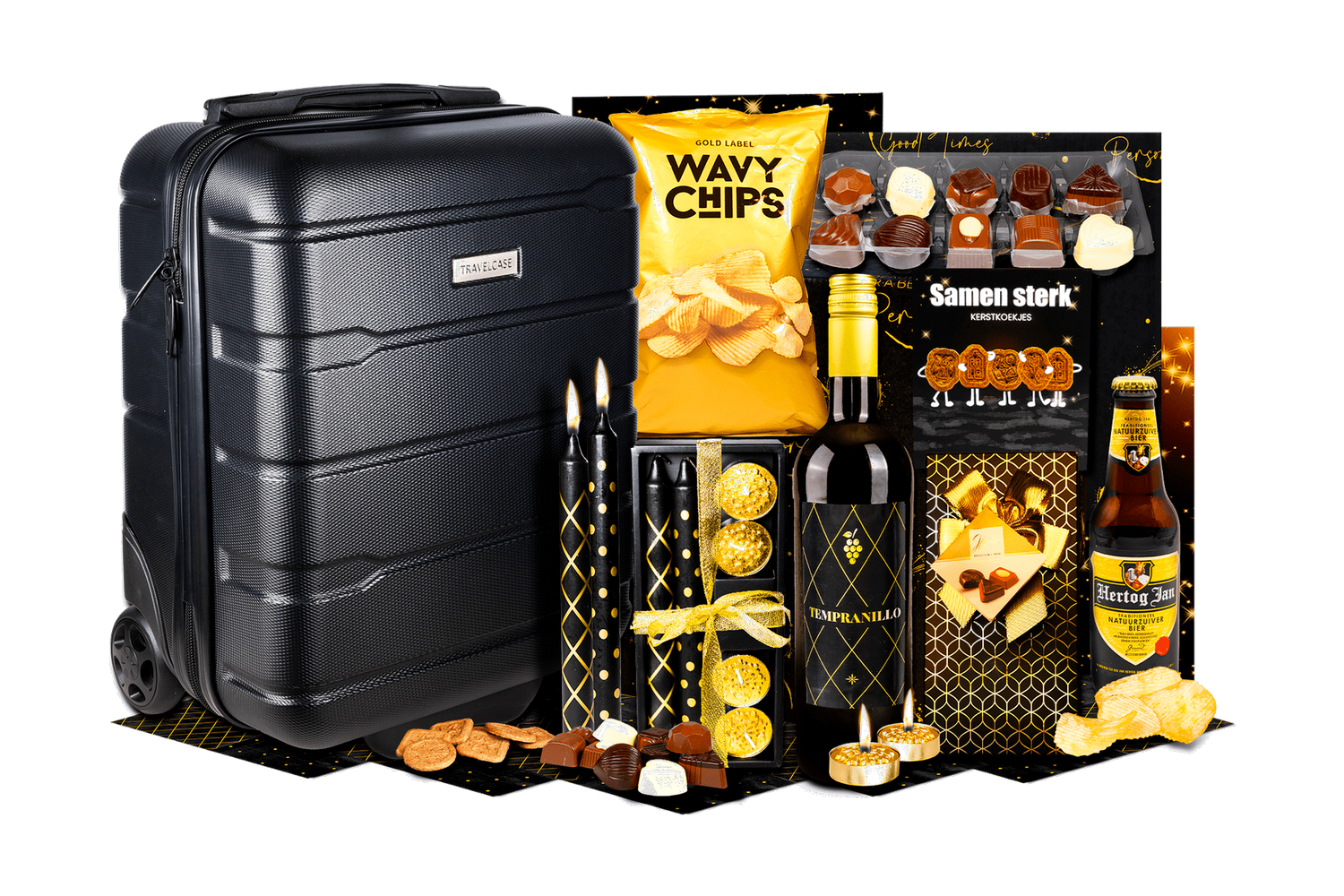 Op rolletjes… Een complete, feestelijke giftset met een praktische trolley en luxe lekkernijen. Klaar om direct te geven en ideaal voor sfeervolle kerstmomenten.