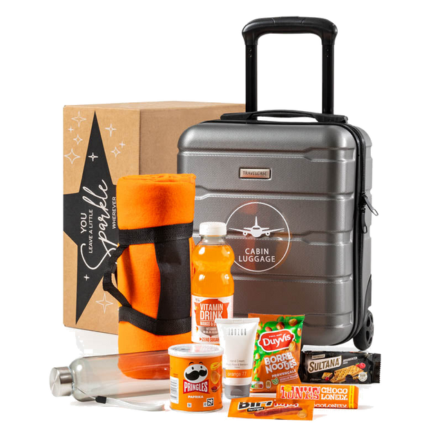 Verras een reisliefhebber met dit complete kerstpakket: ideaal voor korte trips en direct klaar voor vertrek. Dit stijlvolle pakket bevat een compacte cabin-size trolley die als handbagage meegenomen mag worden en slimme travel-essentials die elke reis comfortabeler maken. Met lekkere snacks, een warme fleecedeken en een herbruikbare drinkfles is dit cadeau zowel praktisch als verrassend persoonlijk — perfect voor collega’s, vrienden of familie die vaak onderweg zijn.