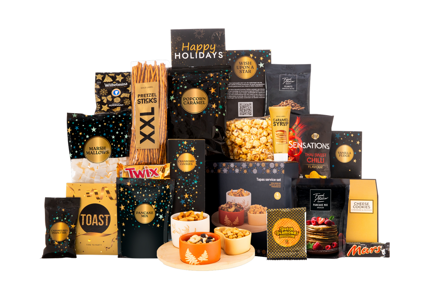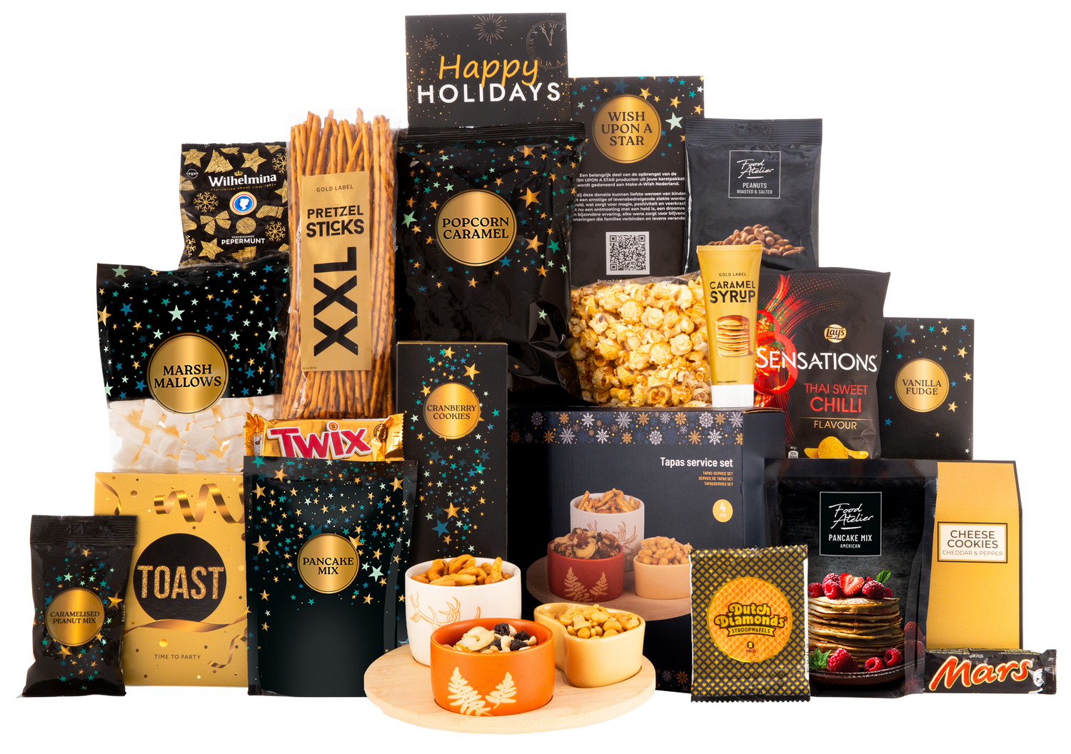 Of je nu op zoek bent naar iets om onder de kerstboom te leggen of een attentie voor op kantoor: dit cadeaupakket biedt voor ieder wat wils. Van knapperige chips en smeuïge stroopwafels tot chocoladeklassiekers en verfrissende frisdrankjes. Alles is stijlvol verpakt in een feestelijke geschenkdoos met een vrolijke Happy Holidays kaart, zodat je geen extra verpakkingswerk meer hebt.